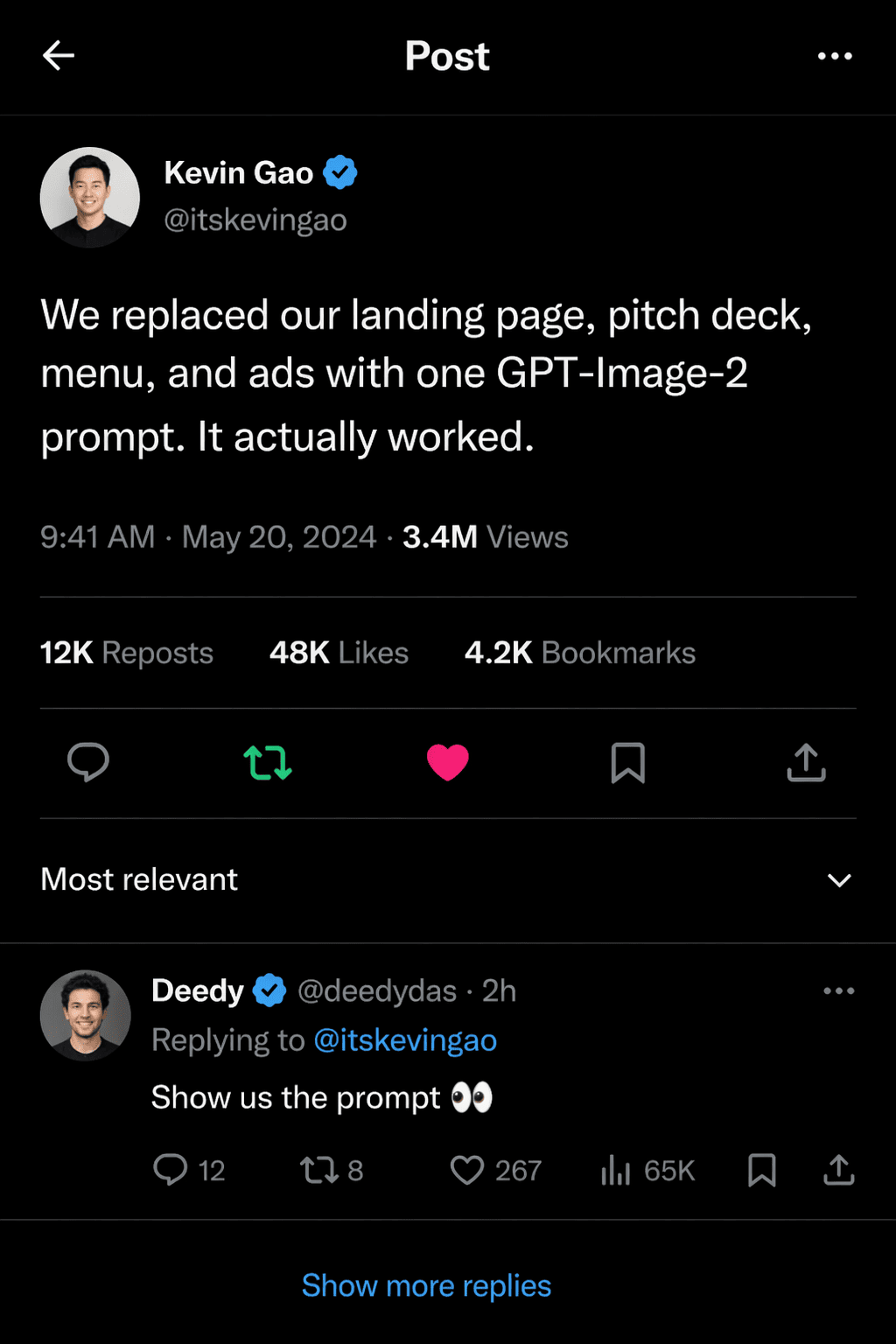 use gpt-image-2. Create a realistic viral X-style post screenshot from a startup founder announcing a launch. Exact post text: "We replaced our landing page, pitch deck, menu, and ads with one GPT-Image-2 prompt. It actually worked." Show a verified founder profile, clean avatar, timestamp area, believable engagement metrics "3.4M Views", "12K Reposts", "48K Likes", one visible reply preview, crisp typography, and authentic social-media spacing. Make it feel indistinguishable from a real viral tech post screenshot. ratio 4:5